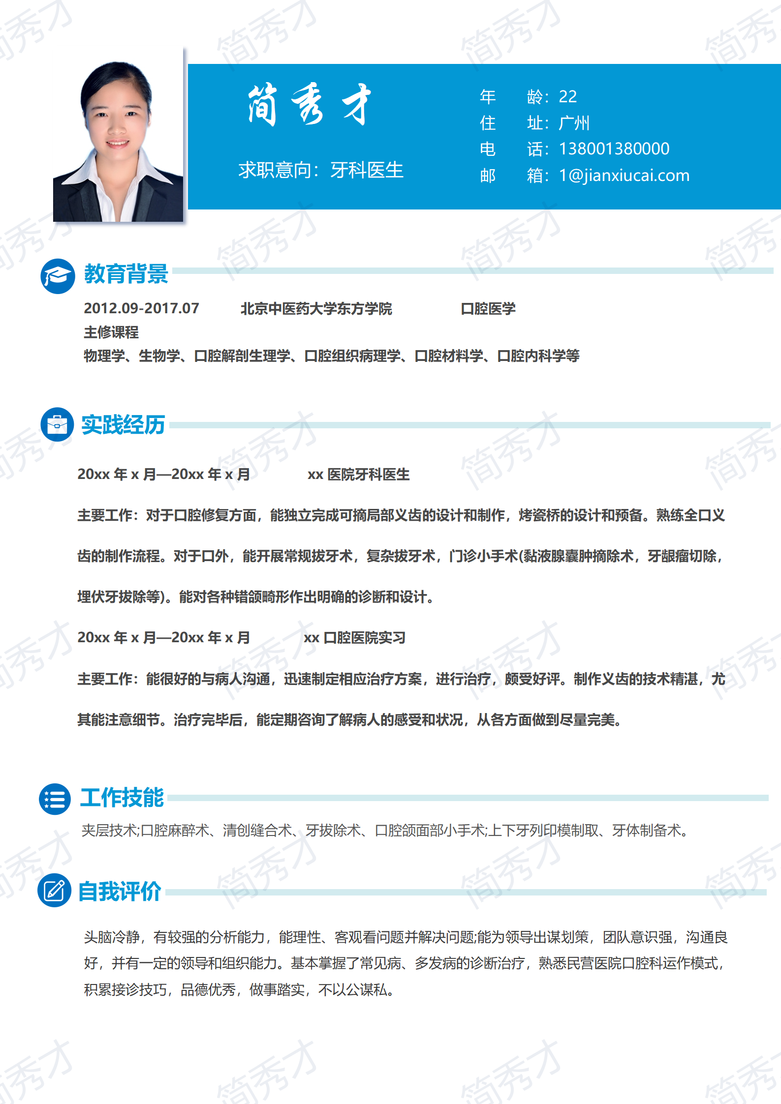 首页>模板下载>三页蓝色商务口腔科医生护士简历模板11