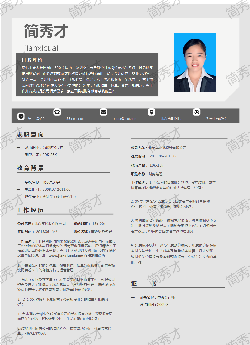 沉稳比较正式的word求职简历模板财务类,这份简历模板的格式为word文档格式,比较方便我们编辑修改。