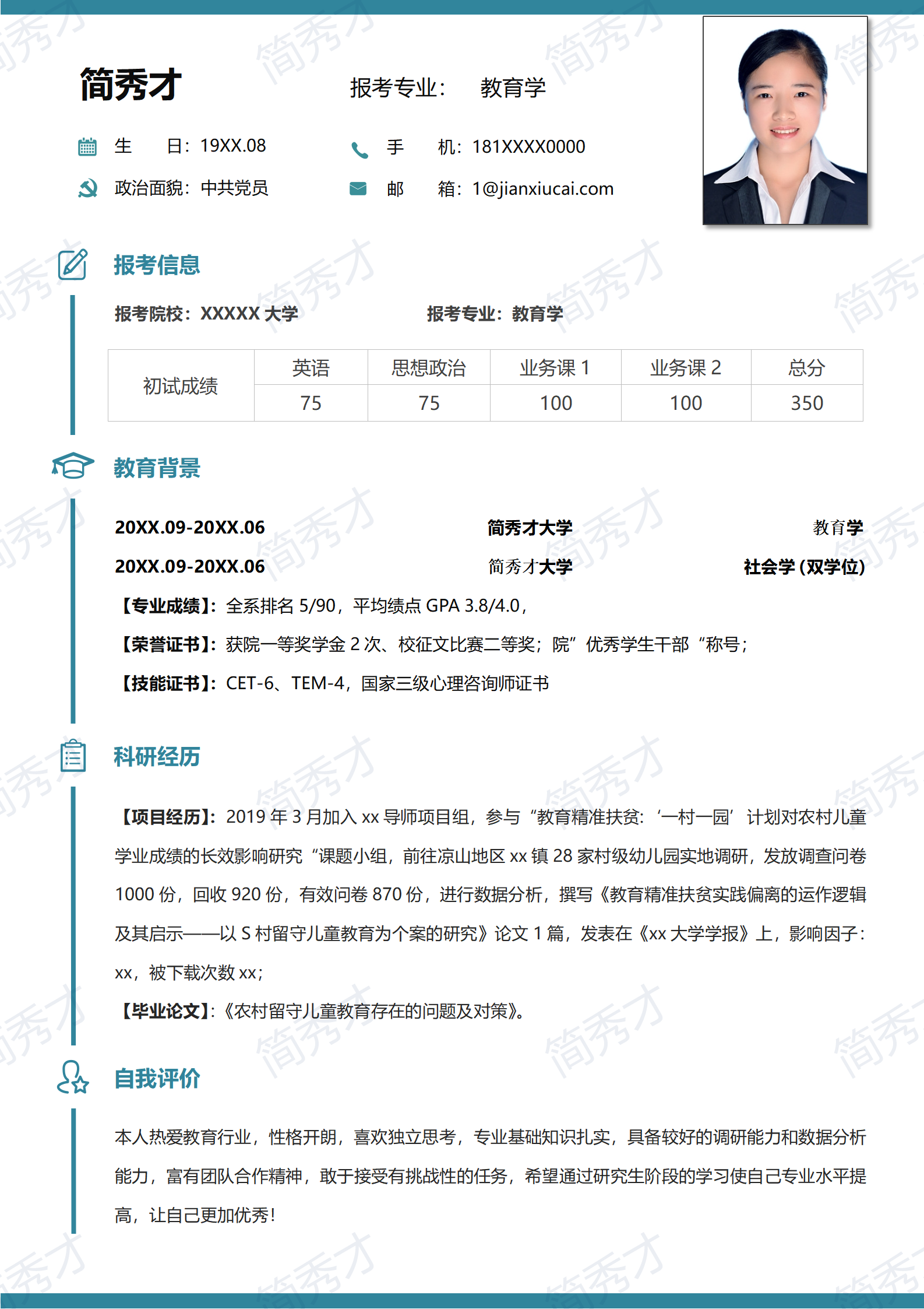 首页>模板下载>单页蓝色教育学考研复试简历模板62