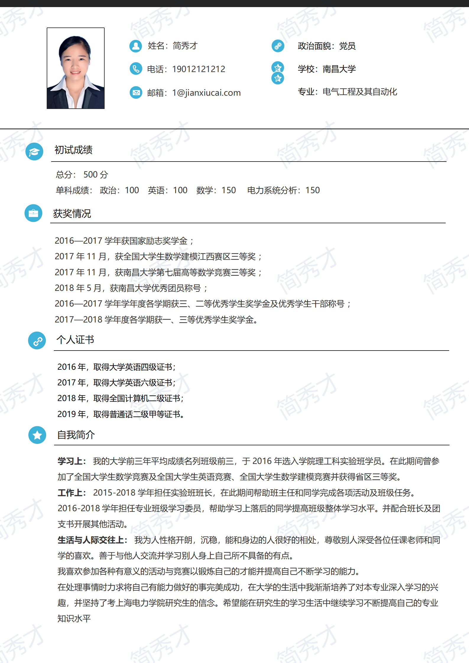 首页>模板下载>单页电气工程和自动化专业考研复试简历模板81